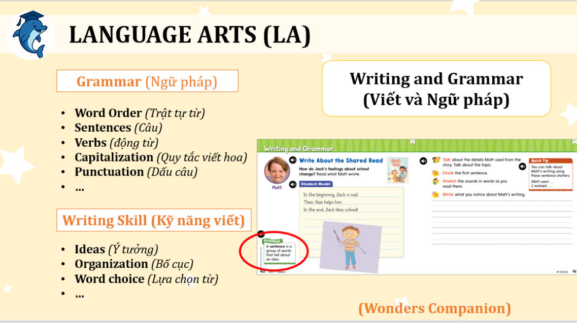 Giáo trình Reading Wonders sẽ giúp các em rèn luyện kỹ năng viết vốn là “điểm yếu” của học sinh Việt, với phần Ngữ pháp và Viết học song song học sinh được tham gia các hoạt động như: Viết văn bản, Luyện viết, Viết thư,… để làm quen với các thể loại văn học cũng như phong cách viết khác nhau. Ví dụ ngay từ chương trình G1, các em đã làm quen với cách viết những bài văn ngắn với chủ đề gần gũi với cuộc sống xung quanh của các em.